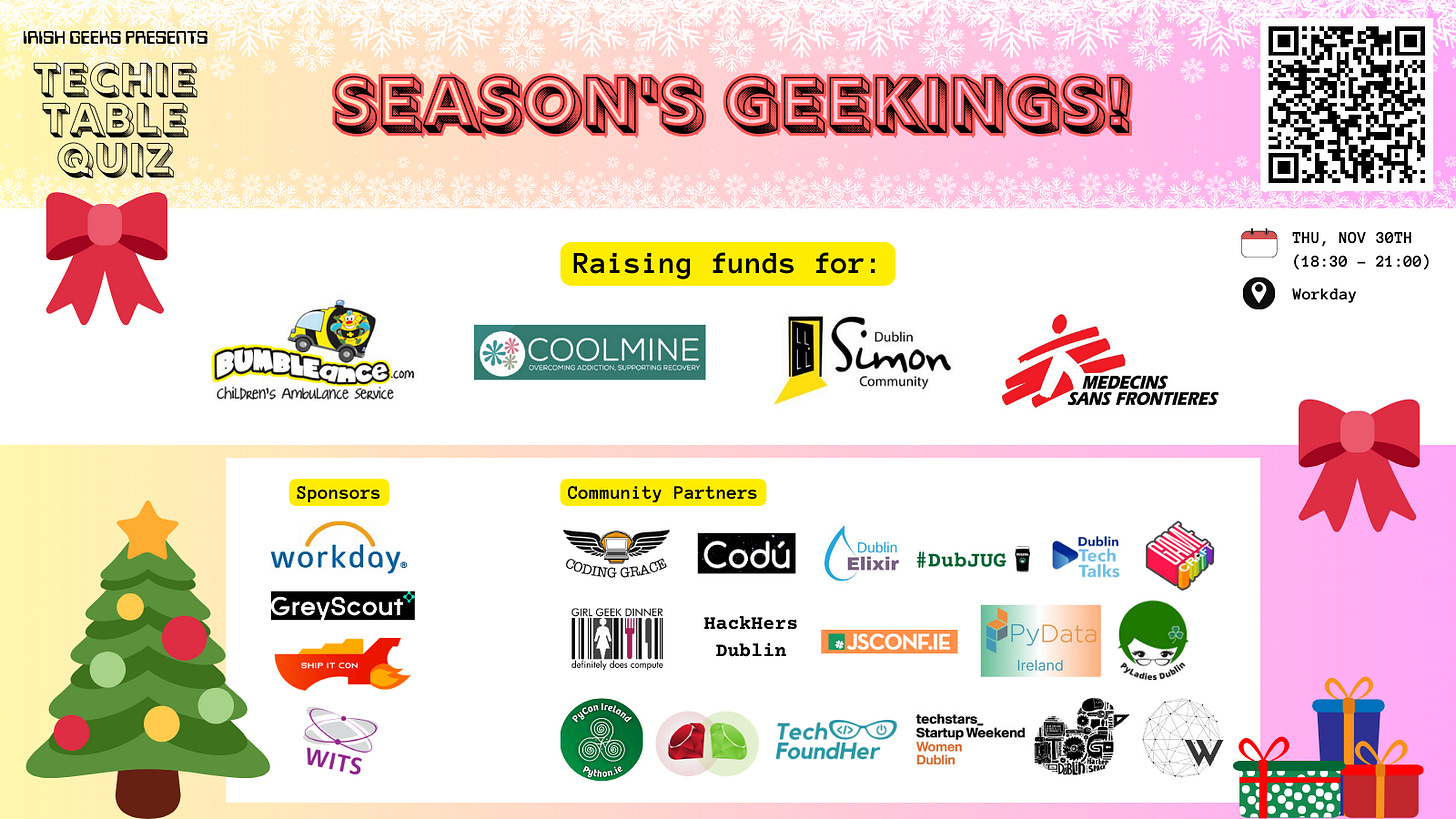 And finally the big comeback event this year for us to be part of is the Irish Techie Charity Quiz, bringing together as many of the Irish Tech community groups under one roof, meet each other, have some end of year fun and raising money for not one but four charities this year! 🙌
