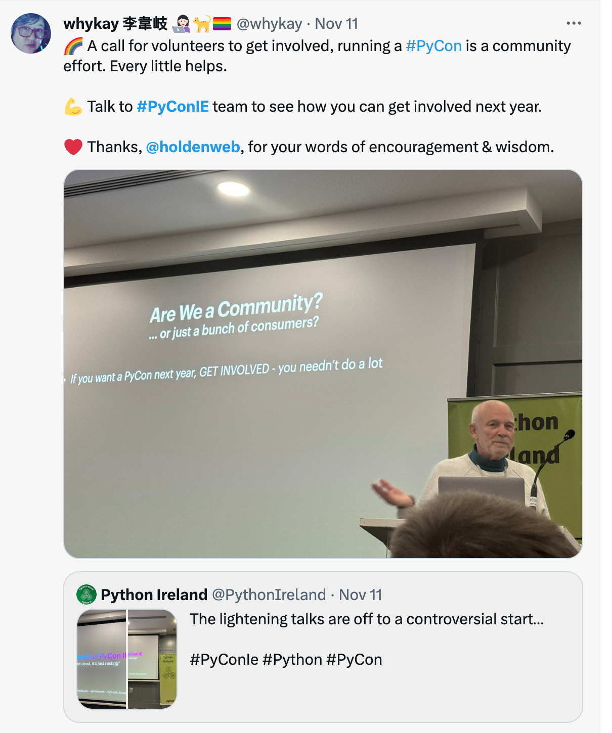 A special thanks to Steven Holden (who have given me amazing support and advice when I was running PyCon Ireland in the earlier days) on why community is important. So are we a “just a bunch of consumers”?